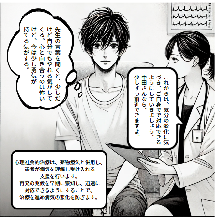 心理療法(カウンセリング)は、症状をコントロールするためのスキルやストレス対処法を学ぶことができます。認知行動療法(CBT)は、特に効果があるとされています。